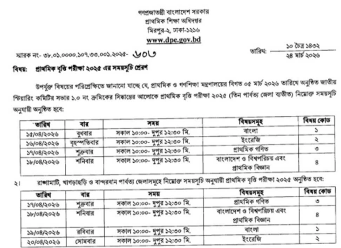২০২৫ সালের প্রাথমিক বৃত্তি পরীক্ষার সময়সূচি প্রকাশ করেছে প্রাথমিক শিক্ষা অধিদপ্তর। আগামী ১৫ এপ্রিল থেকে দেশের অধিকাংশ জেলায় একযোগে এ পরীক্ষা শুরু হবে।
