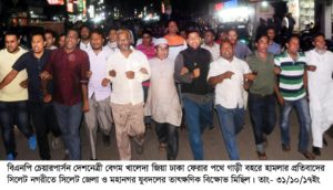 সিলেট জেলা ও মহানগর যুবদল ।। বিএনপি চেয়ারপার্সন দেশনেত্রী বেগম খালেদা জিয়া কক্সবাজার থেকে ঢাকা ফেরার পথে ফেনীর মহিপালে গাড়ী বহরে হামলার প্রতিবাদে ৩১ অক্টোরব মঙ্গলবার সন্ধ্যা ৭টায় বাংলাদেশ জাতীয়তাবাদী যুবদল সিলেট জেলা ও মহানগর শাখার উদ্যোগে নগরীর আম্বরখানা থেকে তাৎক্ষণিক এক প্রতিবাদ বিক্ষোভ মিছিল বের হয়। মিছিলটি নগরীর প্রধান প্রধান সড়ক প্রদক্ষিণ শেষে চৌহাট্টা পয়েন্টে প্রতিবাদ সভা মাধ্যমে শেষ হয়।