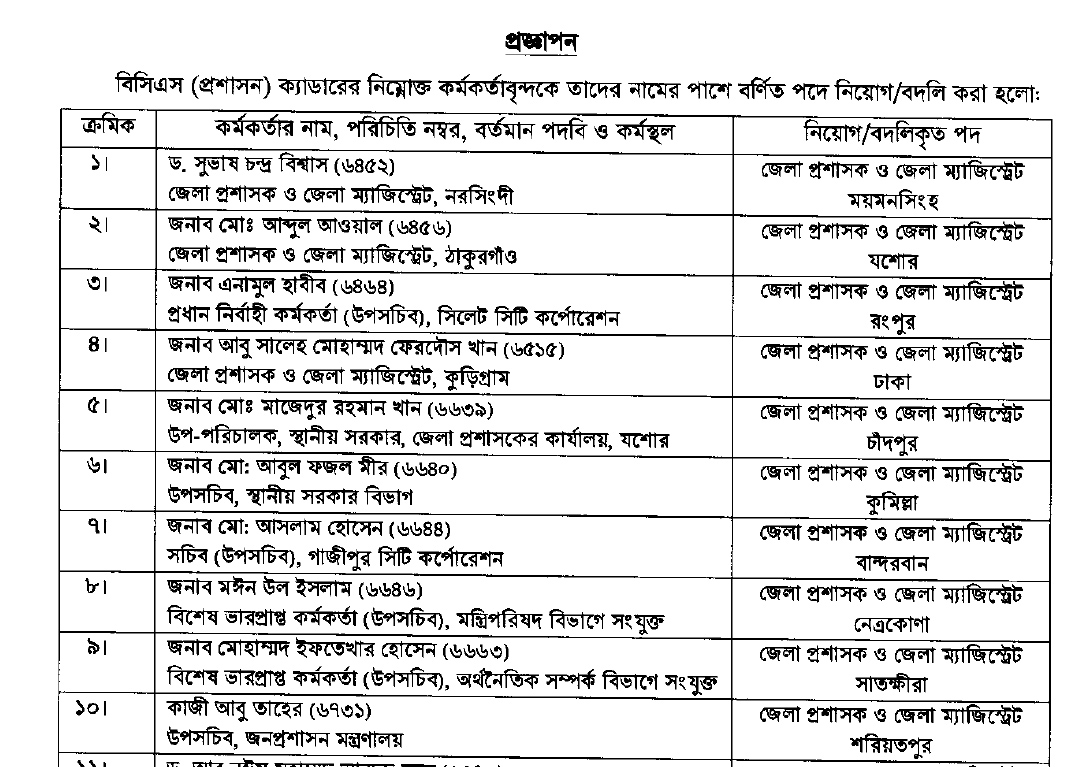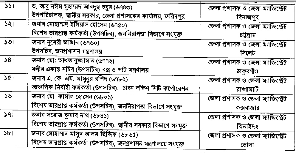 নতুনদের মধ্যে সিলেট সিটি করপোরেশনের প্রধান নির্বাহী কর্মকর্তা এনামুল হাবীবকে রংপুর, যশোরের স্থানীয় সরকার বিভাগের উপপরিচালক মো. মাজেদুর রহমান খানকে চাঁদপুর, স্থানীয় সরকার বিভাগের উপসচিব মো. আবুল ফজল মীরকে কুমিল্লা, গাজীপুর সিটি করপোরেশনের সচিব মো. আসলাম হোসেনকে বান্দরবান, মন্ত্রিপরিষদ বিভাগে সংযুক্ত বিশেষ ভারপ্রাপ্ত কর্মকর্তা মঈন উল ইসলামকে নেত্রকোনা, অর্থনৈতিক সম্পর্ক বিভাগে সংযুক্ত বিশেষ ভারপ্রাপ্ত কর্মকর্তা মো. ইফতেখার হোসেনকে সাতক্ষীরা, জনপ্রশাসন মন্ত্রণালয়ের উপসচিব কাজী আবু তাহেরকে শরীয়তপুর, ফরিদপুরের স্থানীয় সরকার বিভাগের উপপরিচালক ড. আবু নঈম মুহাম্মদ আবদুছ ছবুরকে দিনাজপুর, জননিরাপত্তা বিভাগে সংযুক্ত বিশেষ ভারপ্রাপ্ত কর্মকর্তা মোহাম্মদ ইলিয়াস হোসেনকে চট্টগ্রাম, জনপ্রশাসন মন্ত্রণালয়ের উপসচিব নুমেরী জামানকে সিলেট, বস্ত্র ও পাটমন্ত্রীর একান্ত সচিব মো. আখতারুজ্জামানকে ঠাকুরগাঁও, ঢাকা দক্ষিণ সিটি করপোরেশনের আঞ্চলিক নির্বাহী কর্মকর্তা এ. কে. এম. মামুনুর রশিদকে রাঙামাটি, জননিরাপত্তা বিভাগে সংযুক্ত বিশেষ ভারপ্রাপ্ত কর্মকর্তা মো. কামাল হোসেনকে কক্সবাজার, স্থানীয় সরকার বিভাগে সংযুক্ত বিশেষ ভারপ্রাপ্ত কর্মকর্তা সরোজ কুমার নাথকে ঝিনাইদহ, জনপ্রশাসন মন্ত্রণালয়ে সংযুক্ত বিশেষ ভারপ্রাপ্ত কর্মকর্তা মোহাম্মদ মাসুদ আলম ছিদ্দিককে ভোলা, লালমনিরহাটের স্থানীয় সরকার বিভাগের উপপরিচালক মোছা. সুলতানা পারভীনকে কুড়িগ্রাম, জনপ্রশাসন মন্ত্রণালয়ে সংযুক্ত বিশেষ ভারপ্রাপ্ত কর্মকর্তা সৈয়দা ফারহানা কাউনাইনকে নরসিংদী, বিদ্যুৎ বিভাগের উপসচিব মাহমুদুল কবীর মুরাদকে হবিগঞ্জ ও ঢাকা ক্যান্টনমেন্টের নির্বাহী কর্মকর্তা এস এম আব্দুল কাদেরকে রাজশাহী জেলার ডিসি হিসেবে নিয়োগ দেওয়া হয়েছে।