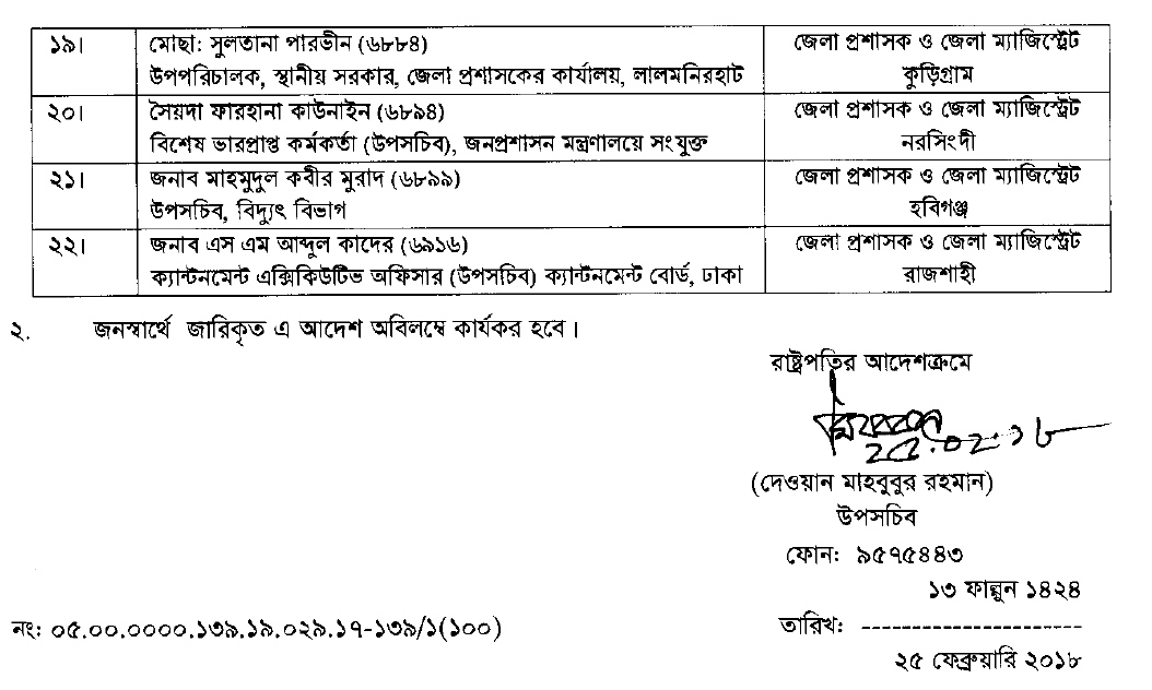 রাষ্ট্রপতির আদেশক্রমে প্রজ্ঞাপনে সই করেন জনপ্রশাসন মন্ত্রণালয়ের উপসচিব দেওয়ান মাহবুবুর রহমান।