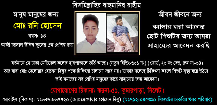 সিলেট সংবাদ ডেস্ক : স্কুল ছাত্র রনিকে বাঁচাতে সাহায্যের হাত বাড়িয়ে দিন। মোঃ রনি হোসেন ১৪ বছরের ছোট্ট এই শিশুটি ক্যান্সার রোগদ্বারা আক্রান্ত।
